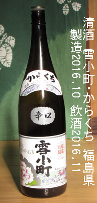 雪小町・からくち 普通酒(福島県)製造年月 --- 平成28年(2016年)10月 試飲時期 --- 平成28年(2016年)11月 級 --------- 普通酒 アルコ−ル分 --- 15度 価格 ------- 一升瓶 1,609 円でした。 原材料名 --- 米(国産)・米麹(国産米)・醸造アルコール 精米歩合 --- % 日本酒度 --- 醸造会社 --- 有限会社 渡辺酒造本店 福島県郡山市西田町三町目字桜内10 ホームページ: ↓↓↓ 味わい 当時のメモ ↓↓↓常温:苦辛味が通常よりも強いが、辛口の好きな人には丁度よい辛味だ。 これと言った味はない。 燗:常温同様。備考: |
