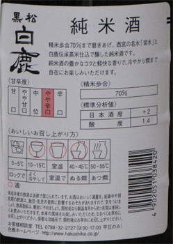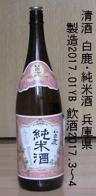 白鹿(はくしか?)・純米酒(兵庫県)製造年月 --- 平成29年(2017年)01月YB 試飲時期 --- 平成29年(2017年)3〜4月 級 --------- 純米酒 アルコ−ル分 --- 14度以上15度未満 価格 ------- 一升瓶 約1,393 円でした。 原材料名 --- 米(国産)・米こうじ(国産米) 精米歩合 --- 70% 日本酒度 --- +2 酸度 ------- 1.4 アミノ酒度 - 醸造会社 --- 辰馬本家酒造株式会社 兵庫県西宮市建石町二番一〇号 TEL: 0798-32-2727 ホームページ http://www.hakushika.co.jp ↓↓↓ 味わい 当時のメモ ↓↓↓常温:まあ一応純米らしく飲める。やや平凡な味。 特にいい刺激もなく特に旨味もない。 純米酒で1,393円と格安なのだから、こんなものかも。 燗:常温同様。良く言えば、穏やかな味。 備考:格安の純米酒だ。よく知れた酒造会社でも瓶のレッテルの何処かに、 会社名の読み方をひらがな等で記載しておいて欲しい。 |