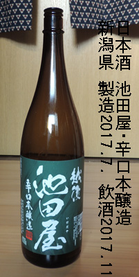 池田屋(いけだや)・辛口本醸造(新潟県)製造年月 --- 平成29年(2017年)7月 試飲時期 --- 平成29年(2017年)11月 級 --------- アルコ−ル分 --- 15度以上16度未満 価格 ------- 一升瓶 1,966 円でした。 原材料名 --- 米(国産)・米こうじ(国産米)・醸造アルコール 精米歩合 --- 65 % 日本酒度 --- 酸度 ------- 醸造会社 --- 池田屋酒造株式会社 新潟県糸魚川市新鉄1−3−4 ↓↓↓ 味わい 当時のメモ ↓↓↓常温:全体的に旨味あり。特に旨いというのじゃないけれど、旨い。 深味のある甘さがある。 「辛口本醸造」と記載されているが、辛いとは思わない。 燗:常温同様、甘さに深味あり。備考: |