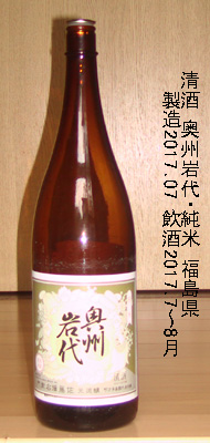 奥州岩代()・純米(福島県)製造年月 --- 平成29年(2017年)07月 飲酒時期 --- 平成29年(2017年)7〜8月 級 --------- 純米酒 アルコ−ル分 --- 14度 価格 ------- 一升瓶 1,934 円でした。 原材料名 --- 米(国産)・米こうじ(国産米) 精米歩合 --- 58% 日本酒度 --- 酸度 ------- アミノ酒度 - 醸造会社 --- 合資会社 大和川酒造店 福島県喜多方市字押切南2-115 ↓↓↓ 味わい 当時のメモ ↓↓↓常温:やや甘いが呑める。辛味も適度にあり。 特別な特徴はない。 以前の1級の味。 燗:常温よりも辛味が強くなった。アルコールの刺激も強くなった。 美味しく呑める甘辛さの刺激がある。 備考: |