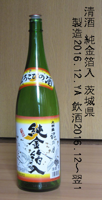 純金箔入・普通酒(茨城県)製造年月 --- 平成28年(2016年)12月YA 試飲時期 --- 平成28年(2016年)12月〜主に翌年1月 級 --------- 普通酒 アルコ−ル分 --- 13度以上14度未満 価格 ------- 一升瓶 約1,700円(年間別種12本組の1本)でした。 原材料名 --- 米(国産)・米麹(国産米)・醸造アルコール・ 糖類・酸味料・金箔 精米歩合 --- % 日本酒度 --- 酸度 ------- 醸造会社 --- 明利酒類株式会社 茨城県水戸市元吉田町338 TEL: ホームページ ↓↓↓ 味わい 当時のメモ ↓↓↓常温:ややまろやか。強い刺激はないが旨く飲める。 燗:常温とほとんど同じ。晩酌にはいい酒だ。 備考: |