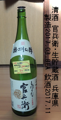 官兵衛・生貯蔵酒(兵庫県)製造年月 --- 平成29年(2017年)03月BEA 試飲時期 --- 平成29年(2017年)11月 級 --------- アルコ−ル分 --- 13度以上14度未満 価格 ------- 一升瓶 1,018 ---> 814 円でした。 原材料名 --- 米(国産)・米麹(国産米)・醸造アルコール 精米歩合 --- % 日本酒度 --- 酸度 ------- 醸造会社 --- 名城酒造株式会社 兵庫県姫路市豊富町豊富2222の5 ホームページ http://www.meijoshuzou.co.jp/ ↓↓↓ 味わい 当時のメモ ↓↓↓常温:甘味が旨味となる。旨くてどんどん呑める。 この値段では大変お買い得だ。 燗:常温同様、旨くどんどん呑める。備考: |
