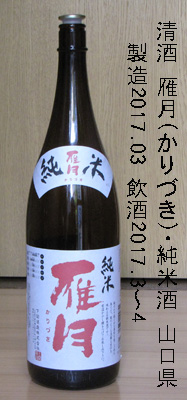 雁月(かりづき)・純米酒(山口県)製造年月 --- 平成29年(2017年)03月 試飲時期 --- 平成29年(2017年)3〜4月 級 --------- 純米酒 アルコ−ル分 --- 15度 価格 ------- 一升瓶 1,934 円でした。 原材料名 --- 米(国産)・米麹(国産米) 精米歩合 --- 70 % 日本酒度 --- 酸度 ------- アミノ酒度 - 醸造会社 --- 下関酒造株式会社 山口県下関市幡生宮の下町八番二十三号 TEL: 083-252-1877 ↓↓↓ 味わい 当時のメモ ↓↓↓常温:甘味と辛味が適度にあり、旨く飲める。特殊な味はないが、美味しく飲める。 燗:燗をすると、酒のいい刺激が出た。備考: |