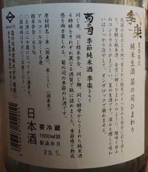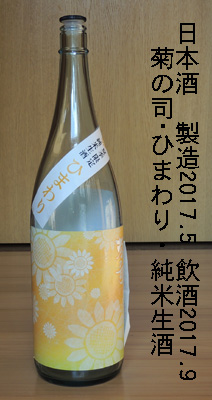 菊の司(きくのつかさ)・ひまわり・純米生酒(岩手県)製造年月 --- 平成29年(2017年)5月 飲酒時期 --- 平成29年(2017年)9月 級 --------- 純米生酒 アルコ−ル分 --- 15度 価格 ------- 一升瓶 2,376 円でした。 原材料名 --- 米(国産)・米こうじ(国産米) 精米歩合 --- 65% 日本酒度 --- 酸度 ------- アミノ酒度 - 醸造会社 --- 菊の司酒造株式会社 岩手県盛岡市紺屋町四番二十号 ↓↓↓ 味わい 当時のメモ ↓↓↓常温:旨い。深味のある味。甘味辛味は丁度良い。 燗:やや甘すぎる感があるが、旨味も充分ある。麹黴(こうじかび)の香りと味がする。 備考:「夏期限定純米生酒」との記載あり。 販売店では、冷蔵していた。冷やでも美味しかったが、常温・燗ででも結構美味しく呑めた。 |