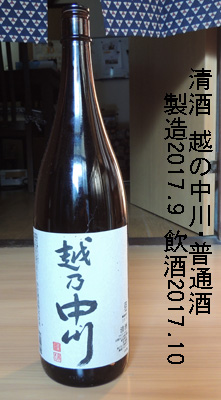 越の中川・普通酒(新潟県)製造年月 --- 平成29年(2017年)9月 試飲時期 --- 平成29年(2017年)10月 級 --------- 純米酒 アルコ−ル分 --- 15度以上16度未満 価格 ------- 一升瓶 1,720 円でした。 原材料名 --- 米(国産)・米こうじ(国産米)・醸造アルコール 精米歩合 --- % 日本酒度 --- 酸度 ------- 醸造会社 --- 中川酒造株式会社 新潟県長岡市脇野町2011 ↓↓↓ 味わい 当時のメモ ↓↓↓常温:標準的な味。特徴はないがなんなく呑める。 燗:常温同様だ。備考: |