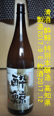 酔鯨(すいげい)・特別本醸造(高知県)製造年月 --- 平成29年(2017年)9月E 試飲時期 --- 平成29年(2017年)12月 級 --------- 純米酒 アルコ−ル分 --- 15度 価格 ------- 一升瓶 約 2,100 円でした。 原材料名 --- 米・米麹・醸造アルコール 原材料米はすべて国産 精米歩合 --- 55 % 日本酒度 --- 酸度 ------- 醸造会社 --- 酔鯨酒造株式会社 高知市長浜566-1 TEL: 0954-63-2468 ↓↓↓ 味わい 当時のメモ ↓↓↓常温:何か花の香りのような香りの性質がある。口内で味わおうとしてもすぐに喉に通したくなる。 香ばしさが口に沈んで行く。 燗:芳香せいあり。刺激は常温のときよりやや減少。 辛味はやや増加してほんのりと呑める。 備考: |
