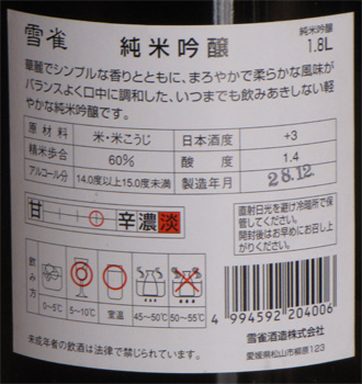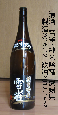 雪雀(ゆきすずめ)・純米吟醸(愛媛県)製造年月 --- 平成28年(2016年)12月 試飲時期 --- 平成29年(2017年)2月 級 --------- 純米吟醸 アルコ−ル分 --- 14.0度以上15.0度未満 価格 ------- 一升瓶 約2,000 円でした。 原材料名 --- 米・米こうじ 精米歩合 --- 60 % 日本酒度 --- +3 酸度 ------- 1.4 醸造会社 --- 雪雀酒造株式会社 愛媛県松山市柳原123 ↓↓↓ 味わい 当時のメモ ↓↓↓常温:やや芳醇で旨い。甘さ辛さも丁度良い。 燗:常温同様美味しく飲める。純米吟醸の味だ。 備考: |