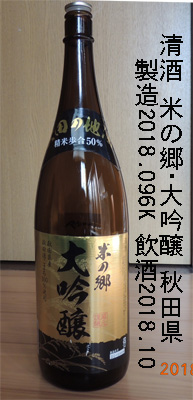 米の郷・大吟醸(秋田県)製造年月 --- 平成30年(2018年)09月6K 試飲時期 --- 平成30年(2018年)10月 級 --------- 大吟醸 アルコ−ル分 --- 15度以上16度未満 価格 ------- 一升瓶 1,699 円でした。 原材料名 --- 米(秋田県産)、米こうじ(秋田県産米)、醸造アルコール 精米歩合 --- 50% 日本酒度 --- 酸度 ------- 醸造会社 --- 秋田県醗酵工業株式会社 秋田県湯沢市深堀字中川原120-8 TEL: 03-3575-2787 URL: http://WWW.oenon.jp ↓↓↓ 味わい 当時のメモ ↓↓↓常温:特別な味はしないのだが清酒の典型的な味がする。次々と飲みほしてしまいそうになる。 旨さのあ甘味がある。 口内にいい感じで広がって行く。 燗:常温同様旨い酒だ。備考: |