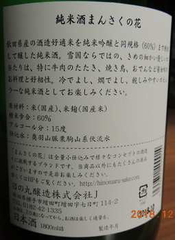 まんさくの花・純米酒(秋田県)製造年月 --- 平成30年(2018年)10月 試飲時期 --- 平成30年(2018年)11月 級 --------- 純米酒 アルコ−ル分 --- 15度 価格 ------- 一升瓶 値引きで 2,592 円でした。 原材料名 --- 米(国産)・米麹(国産米) 精米歩合 --- 60% 日本酒度 --- 酸度 ------- 醸造会社 --- 日の丸醸造株式会社 秋田県横手市増田町増田字七日町114-2 TEL: 0182-42-1335 URL: https://hinomaru-sake.com ↓↓↓ 味わい 当時のメモ ↓↓↓常温:適度に丁度良いおいしさで呑める。燗:常温同様、何時でも標準的に美味しく呑める。備考: |