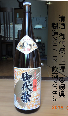 御代榮(みよさかえ)・上撰(愛媛県)製造年月 --- 平成29年(2017年)12月 試飲時期 --- 平成30年(2018年)5月 級 --------- 上撰 アルコ−ル分 --- 15度以上16度未満 価格 ------- 一升瓶 1,985 円でした。 原材料名 --- 米(国産)・米こうじ(国産米)・醸造アルコール 精米歩合 --- % 日本酒度 --- 酸度 ------- 醸造会社 --- 成龍酒造株式会社 愛媛県西条市周布1301-1 TEL: 0898-68-8566 ↓↓↓ 味わい 当時のメモ ↓↓↓常温:この級だと、この程度の旨味はいい方だ。昔の一級酒の中の旨い酒の味。 燗:芳醇性はないが、いい刺激があり、昔流の上級な酒だ。 備考: |
