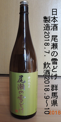 尾瀬の雪どけ・特別純米(群馬県)製造年月 --- 平成30年(2018年)7月 試飲時期 --- 平成30年(2018年)9〜10月 級 --------- 特別純米 アルコ−ル分 --- 15度 価格 ------- 一升瓶 値引きで 2,401 円でした。 原材料名 --- 米(国産)・米麹(国産米) 精米歩合 --- 50% 日本酒度 --- 酸度 ------- 醸造会社 --- 龍神酒造株式会社 群馬県館林市西本町7-13 TEL: 0276(72)3711 ↓↓↓ 味わい 当時のメモ ↓↓↓常温:酸っぱくて強い特殊な味。昨日の酸っぱ味はない。むしろ、甘味が増した。 5日前の開封時や4日前よりも深い甘味が増した。 同じ日に開封した別会社の酒では、その味に変化はない。 美味しく呑める酒だ。いくら飲んでもまだまだ飲みたくなる味の酒だ。 いつものように旨く呑めるが、今日は以前程ではない。 体調によって酒の味も変わるという証拠だ。 燗:甘味と辛味どちらも常温のときよりも増した。味も全体的に濃厚となった。濃厚過ぎるほどだ。 ごくっと染み込む。 備考: |