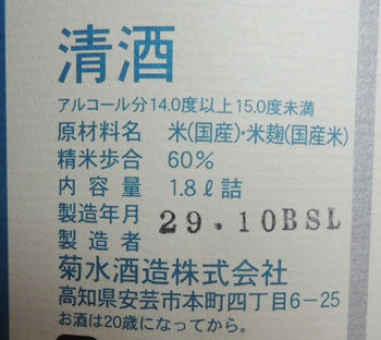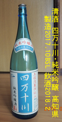 四万十川(しまんとがわ)・純米吟醸酒(高知県)製造年月 --- 平成29年(2017年)10月BSL 試飲時期 --- 平成30年(2018年)2月 級 --------- 純米吟醸酒 アルコ−ル分 --- 14.0度以上15.0度未満 価格 ------- 一升瓶 1,954 円でした。 原材料名 --- 米(国産)・米麹(国産米) 精米歩合 --- 60 % 日本酒度 --- 酸度 ------- 醸造会社 --- 菊水酒造株式会社 高知県安芸市本町四丁目6-25 ホームページ http://www.suishinsake.co.jp/ ↓↓↓ 味わい 当時のメモ ↓↓↓常温:特殊な味がする。その味の表現むつかしいが、何だか「ゆず」のような味みたい。 考えてみると、この酒の製造地は高知県安芸市で、 その地方は「ゆず」の産地で有名だ。 ゆず畑の土壌をくぐり抜けた水で造った酒なのかも? それとも、米麹黴にゆずの味が染み込んでいるのか? 燗:常温のときのあの特有の味が別の味に変化した。こちらの味の方が飲みよい。 冷めてくるとまた常温のときのあの味に戻った。 面白い酒だ。 備考: |