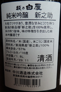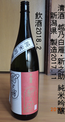 越乃白雁・純米吟醸(新潟県)製造年月 --- 平成29年(2017年)11月 試飲時期 --- 平成30年(2018年)2月 級 --------- 純米吟醸 アルコ−ル分 --- 16度 価格 ------- 一升瓶 2,786 円でした。 原材料名 --- 米(国産)・米こうじ(国産米) 新潟県産「猿之助」100% 使用 精米歩合 --- 57 % 日本酒度 --- 酸度 ------- 醸造会社 --- 中川酒造株式会社 新潟県長岡市脇野町2011 ↓↓↓ 味わい 当時のメモ ↓↓↓常温:適度に旨く呑める。純米酒の標準的な味。深味と旨味がややある。 燗:ほんわりとした暖かい味。常温よりも旨味が増した。 芳醇な味も出た。米の香りがする味。 備考: |