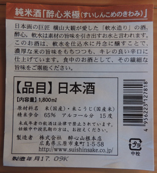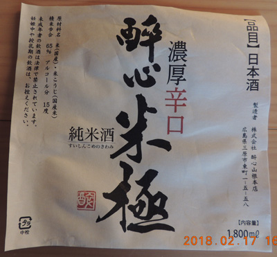 酔心米極(すいしんこめのきわみ)・純米酒(広島県)製造年月 --- 平成29年(2017年)09月K 試飲時期 --- 平成30年(2018年)2月 級 --------- 純米酒 アルコ−ル分 --- 15度 価格 ------- 一升瓶 2,300 が 2,230 円でした。 原材料名 --- 米(国産)・米こうじ(国産米) 精米歩合 --- 65 % 日本酒度 --- 酸度 ------- 醸造会社 --- 株式会社酔心山根本店 広島県三原市東町1-5-58 ホームページ http://www.suishinsake.co.jp/ ↓↓↓ 味わい 当時のメモ ↓↓↓常温:米こうじの付いた米藁(わら)そのままの香りと味。こうじ黴の味がこうなんだろう。 純米酒の味そのものの味がする。 燗:おとなしい酒の味がする。備考: |