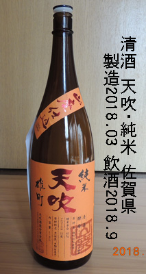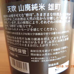 天吹・純米(山廃仕込 雄町)(佐賀県)製造年月 --- 平成30年(2018年)03月 試飲時期 --- 平成30年(2018年)9月 級 --------- 純米 アルコ−ル分 --- 15度 価格 ------- 一升瓶 値引きで 2,366 円でした。 原材料名 --- 米(国産)・米麹(国産米) 精米歩合 --- 65% 日本酒度 --- 酸度 ------- 醸造会社 --- 天吹酒造合資会社 佐賀県三養基郡みやき町大字東尾2894 TEL: ↓↓↓ 味わい 当時のメモ ↓↓↓常温:辛いというか苦いというかその混ざったような独特の味がする。この味は米の種類せいのような気がして瓶に貼られたラベルを読むと、 「原料米雄町100%使用」「天然の花から分離した花酵母を使用」 と書いてあった。納得だ。 燗:辛苦の特有の味あり。「花の酵母の味もする」。 コリーゴールド酵母。 備考: |