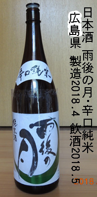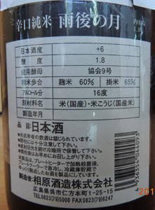 雨後の月・辛口純米酒(広島県)製造年月 --- 平成30年(2018年)4月 試飲時期 --- 平成30年(2018年)5月 級 --------- 純米酒 アルコ−ル分 --- 16度 価格 ------- 一升瓶 2,268 円でした。 原材料名 --- 米(国産)・米こうじ(国産米) 精米歩合 --- 麹米 60% 掛米 65% 日本酒度 --- +6 酸度 ------- 1.8 醸造会社 --- 相原酒造株式会社 広島県呉市仁方本町1-25-15 TEL: 0823-79-5008 ↓↓↓ 味わい 当時のメモ ↓↓↓常温:深味のある酒、さっぱり感もある。やや辛味もあり、嬉しい酒だ。 雨後の夕方晴れて、夜には月が輝き始めた。 空気もさわやかに漂い、 酒を口に含んだときは、複雑な旨い味が口内に染み渡り、 喉を通すと、心がすっきりと晴れ渡った。 燗:常温同様だ。いい辛さで甘味も含まれている。 この辛さが酒を感じさせてくれる。 備考: |