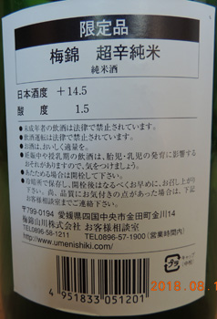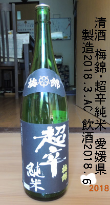梅錦(うめにしき)・超辛純米(愛媛県)製造年月 --- 平成30年(2018年)3月AC 試飲時期 --- 平成30年(2018年)6月 級 --------- 超辛純米 アルコ−ル分 --- 15度以上16度未満 価格 ------- 一升瓶 2,160 円でした。 原材料名 --- 米、米こうじ 精米歩合 --- 65 % 国産米100%使用 日本酒度 --- +14.5 酸度 ------- 1.5 醸造会社 --- 梅錦山川株式会社 愛媛県四国中央市金田町金川14 TEL: 0896-58-1211 ホームページ URL http://www.umenishiki.com/ ↓↓↓ 味わい 当時のメモ ↓↓↓常温:確かに辛口だ。辛味に隠されているのか芳醇性は感じられない。 梅錦特有のいい甘味の旨味がほんの少し感じられる。 燗:常温同様、辛味が強いが常温時よりも良い辛味。備考: |