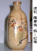 やや艶のある落ち着いた金色の肌に紅梅の花が描かれています。