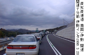 (1)高知高速道路開通 延伸 南国-->伊野(1998.3.20)* 撮影 : 1998.3.20 開通7分前 * 場所 : 伊野インタ−チェンジ * 概説 : 高知道 川之江(愛媛)-- 南国(高知)間が開通して7年目、やっと南国からの延伸が行われました。わずか 17.9 km とは言え、県庁所在地に乗り入れその隣の町まで伸びました。高知市内の人にもやや便利になりましたが、それよりも高知市より西の人が、30−40分もかけて高知市内を通り抜けて南国インタ−に行き来していたのが、15分位に短縮されたのにも大変大きな意義があると思います。 |