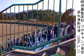 (2)明徳義塾野球部員 プロ野球キャンプ見学撮影 1998.2.11祭日で初春の陽気に誘われて、今春の甲子園出場がきまっている明徳義塾高校へ行って来ました。前もって電話で練習時間を確認して行ったのですが、行ってみれば明徳野球場はもぬけの殻。何かの間違いをおしえられたのでしょう。泣く泣く明徳球場を後にして、プロ野球のキヤンプでも見ようと春野球場へ寄ってみると、明徳野球部員の見学風景が目に飛び込んで来たのです。もぬけの殻の理由がここにあったのです。その見学風景の写真です。帰る号令が掛かりみんな立ち上がって帰り始めた頃の写真です。 |