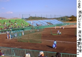 (1)西武ライオンズ撮影 1998.2.11ぽかぽかと暖かい高知春野球場です。 祭日のいい天気に誘われて大勢の野球ファンが駆けつけていました。 球場の外はお祭りみたいな雰囲気とにぎやかさでした。 観覧席もホンワカム−ド、僕も弁当をほう張りながらの観覧(not 観戦)でした。 グランドでは、フリィ−バッティングとサ−ドの守備練習が伸びやかに行われてい ました。 ここで発見したのが、今春甲子園出場が決定している明徳義塾高校野球部員の団体 見学情景でした。 僕がこの春野球場へ来る前に、ここから30km 程離れた明徳義塾高校へ行って来ま した。前もって電話で練習時間を確認して行ったのですが、行ってみれば明徳野球 場はもぬけの殻。何かの間違いをおしえられたのでしょうが、泣く泣く明徳を後に して、春野球場へ行ってみると、明徳野球部員の見学風景が目に飛び込んで来たの です。その見学風景の写真ともぬけの殻の写真を後程お見せします。 |
