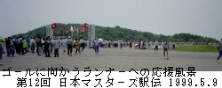 写真左:ゴ−ルに向かう各チ−ムのアンカ−を励ましに行っている大勢のランナ−達や応援者