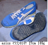 備考 ----- 青色の化繊のアッパ−にアシックス商標の白い帯模様が入っています。このシュ−ズによく似たのがあり、それはアッパ−がやや黄土色がかった白色です。そのシュ−ズは正にマラソン310と呼ばれるものですが、ここに掲載したシュ−ズもマラソン310というのだと思います。単なる色変わりではなく、ほんの少し造りが異なりますのでこの名称にやや自信がありません。